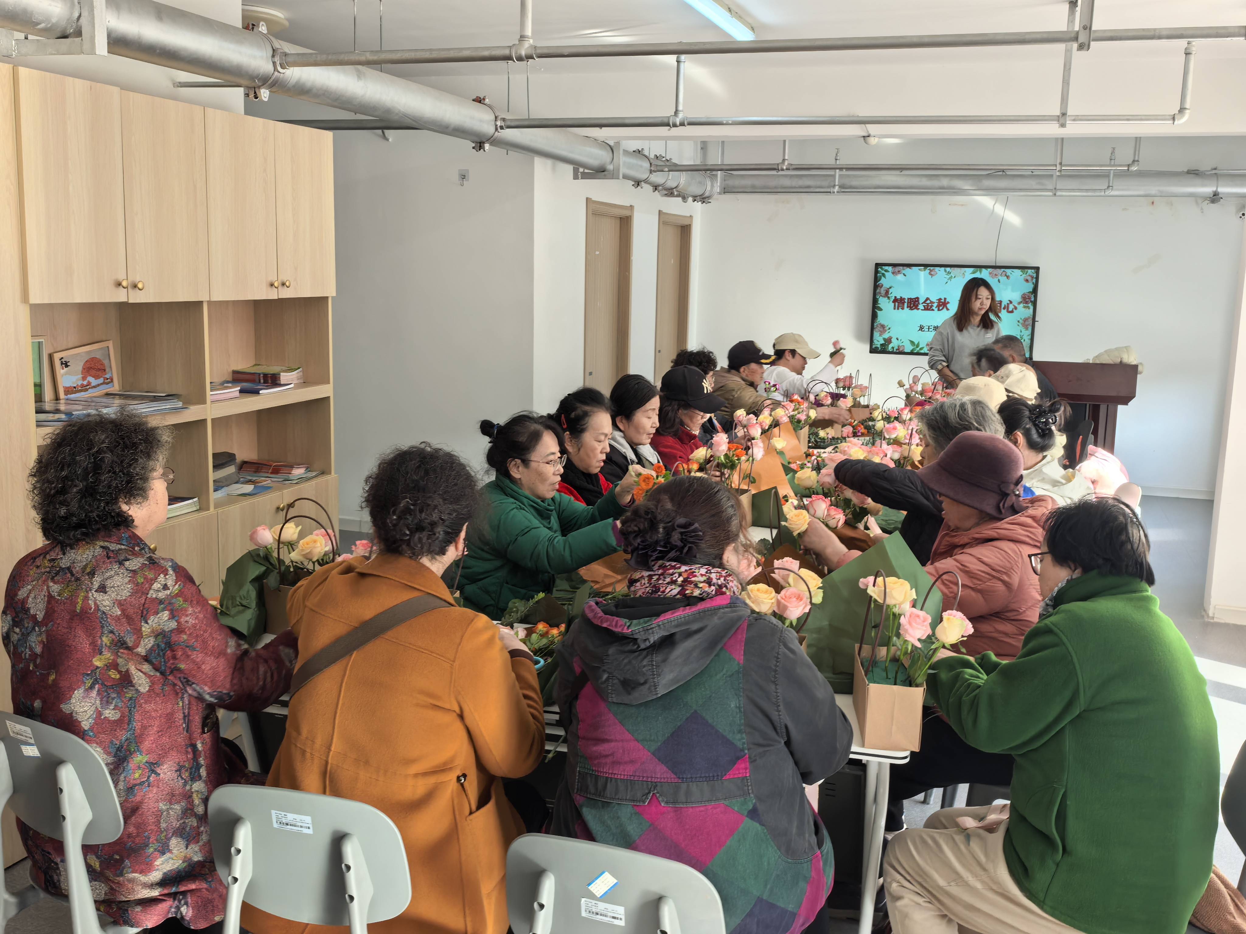 实操环节中,大家手持玫瑰、康乃馨、雏菊等花材,按照老师的指导,修剪枝叶、搭配色彩、调整层次。有的居民相互交流技巧,有的专注构思造型,原本零散的花材在大家手中逐渐变成错落有致、温馨雅致的花艺作品。退休居民李阿姨看着自己的作品,脸上满是笑容:“退休后很少参加这样的活动,今天不仅学会了插花,还认识了新朋友,这个重阳节过得特别有意义!”